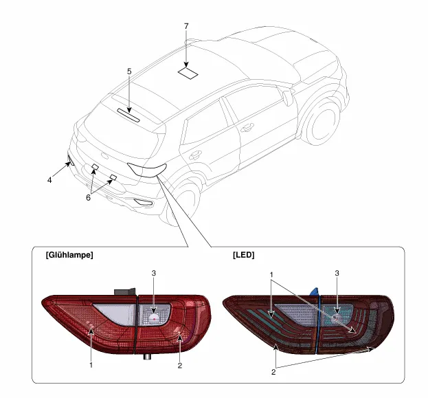 | 1 . Schlussleuchte 2. Brems-/Schlussleuchte 3 . Blinkerleuchte 4 . Rückfahrleuchte |