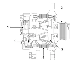 | 1. Bürste 2. OAP : Überlauf-Generatorriemenscheibe 3. Rotor 4. Stator 5. Gleichrichter |
