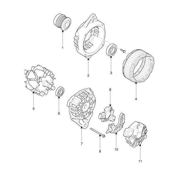 Halterung 8. Bürstenträger 9. Langschraube 10. Gleichrichter 11. Hintere Abdeckung |