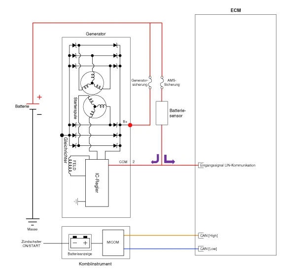 Zusätzlich wird die Ladespannung des Generators vom Batteriespannungserfassungssystem geregelt.