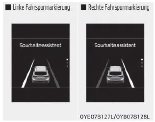 Wenn das Fahrzeug die Fahrspur verlässt, weil das Lenkraddrehmoment des Hilfssystems nicht ausreicht, blinkt die Linienanzeige für die Seite der Abweichung, und es wird ein Warnton ausgegeben.
