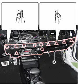 Befestigungsschrauben lösen, dann Armaturenbrettverkleidung (A) auf Beifahrerseite entfernen.