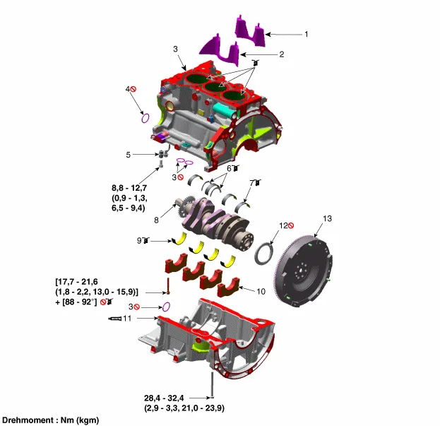 9. Unteres Kurbelwellen-Hauptlager 10. Kurbelwellen-Hauptlagerdeckel 11. Leiterrahmen 12. Hinterer Radial-Dichtring 13. Schwungscheibe |