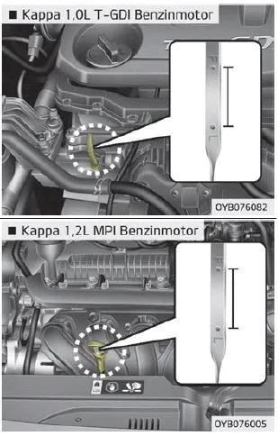 Motorölstand prüfen 1. Vergewissern Sie sich, dass das Fahrzeug auf ebenem Untergrund steht. 2. Starten Sie den Motor und lassen Sie ihn auf die normale Betriebstemperatur kommen.