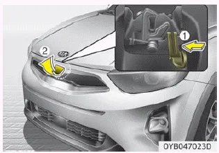 2. Stellen Sie sich vor das Fahrzeug, heben Sie die Motorhaube leicht an, ziehen Sie den Entriegelungshebel der zweiten Verriegelungsstufe (1) unter der Motorhaube nach oben und klappen Sie die Motorhaube (2) hoch.