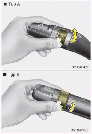 Um die Nebelschlussleuchte einzuschalten, drehen Sie den Nebelschlussleuchtenschalter (1) in die Position ON, wenn das Licht eingeschaltet ist.