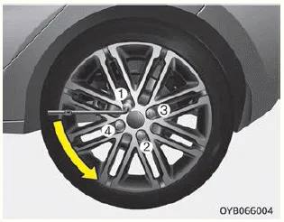 Ziehen Sie nun die Radmuttern mit dem Radmutternschlüssel in der in der Abbildung gezeigten Reihenfolge fest. Stellen Sie sicher, dass der Radmutternschlüssel bis zum Anschlag auf die Radmutter aufgeschoben ist. Stellen Sie sich nicht auf den Griff des Radmutternschlüssels und verwenden Sie kein Rohr, um den Radmutternschlüssel zu verlängern. Ziehen Sie alle Radmuttern ringsum fest. Prüfen Sie anschließend nochmals alle Radmuttern auf festen Sitz. Lassen Sie die Anlage nach einem Radwechsel von einer Fachwerkstatt überprüfen. Kia empfiehlt den Besuch eines Kia-Vertragshändlers/Servicepartners.