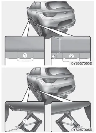 7. Stellen Sie den Wagenheber unter den vorderen (1) oder hinteren (2) Wagenheberaufnahmepunkt neben dem zu wechselnden Rad. Stellen Sie den Wagenheber unter den entsprechenden Aufnahmepunkt am Fahrzeugrahmen. Die Aufnahmepunkte bestehen aus Metallplatten mit zwei Aussparungen und einem hervorstehenden zentralen Führungspunkt, der zu einer Aussparung im Wagenheber passt.