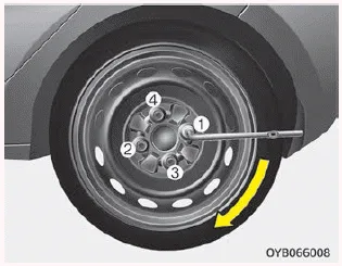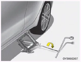 6. Lösen Sie alle Radmuttern um eine Umdrehung gegen den Uhrzeigersinn. Schrauben Sie noch keine Radmutter ab, bevor das Rad nicht soweit angehoben wurde, dass es den Boden nicht mehr berührt.