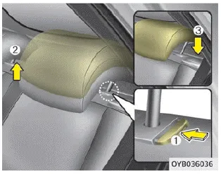 Um die Kopfstütze auszubauen, ziehen Sie die Kopfstütze bis zum Anschlag nach oben. Drücken Sie danach die Sperrtaste (1) und ziehen Sie gleichzeitig die Kopfstütze weiter nach oben (2). Um eine Kopfstütze wieder anzubauen, halten Sie die Sperrtaste (1) gedrückt und schieben Sie die Kopfstützenstangen (3) in die Öffnungen. Stellen Sie danach die Höhe entsprechend ein.