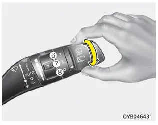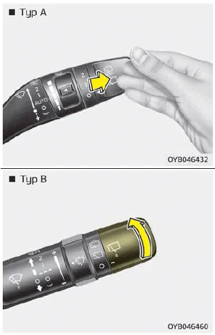 Ziehen Sie den Wischerhebel in der Schalterstellung OFF (O) leicht nach hinten, um Waschwasser auf die Windschutzscheibe zu sprühen und die Scheibenwischer 1-3 Mal wischen zu lassen.