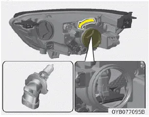 4. Entfernen Sie die Leuchtmittelfassung aus der Scheinwerferbaugruppe, indem Sie die Leuchtmittelfassung nach links drehen, bis die Nasen der Leuchtmittelfassung mit den Schlitzen der Scheinwerferbaugruppe übereinstimmen.