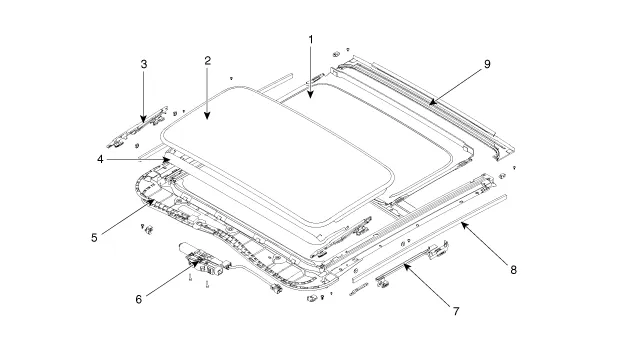 2. Schiebedach-Glasscheibe 3. Schiebedachführung 4. Schiebedach-Deflektor 5. Schiebedach-Hilfsrahmen |