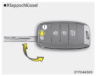Um den Schlüssel auszuklappen, drücken Sie die Freigabetaste; daraufhin klappt der Schlüssel automatisch aus. Um den Schlüssel einzuklappen, halten Sie die Freigabetaste gedrückt und klappen den Schlüssel manuell ein.
