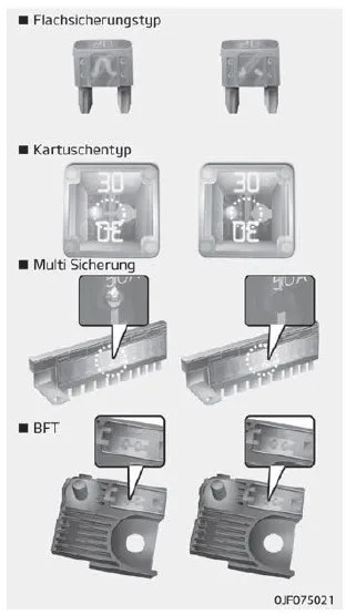 Wenn auch die Ersatzsicherung durchbrennt, weist dies auf ein Problem in der Elektrik hin. Vermeiden Sie den Betrieb der betroffenen Anlage und wenden Sie sich umgehend an eine Fachwerkstatt. Kia empfiehlt, sich an einen Kia-Vertragshändler/Servicepartner zu wenden.