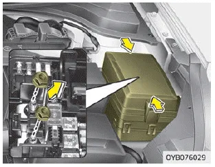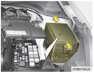 Verschließen Sie nach Arbeiten am Sicherungskasten im Motorraum den Deckel des Sicherungskastens sicher mit hörbarem Einrasten. Andernfalls kann Feuchtigkeit eindringen und elektrische Fehlfunktionen verursachen.