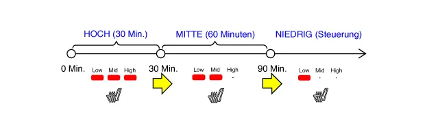 Änderung zu "MID" nach 30 Minuten in "HIGH", dann "LOW" nach 60 Minuten in "MID" |
