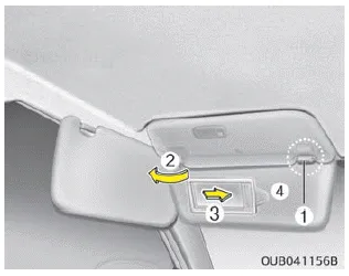Um den Schminkspiegel zu benutzen, klappen Sie die Sonnenblende herunter und schieben Sie die Spiegelabdeckung (3) zur Seite.