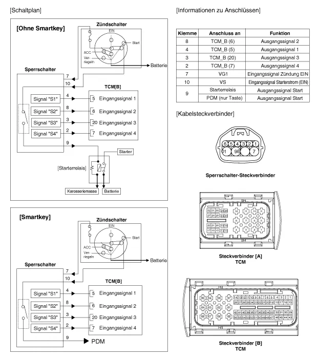 Sperrschaltersignale (S1, S2, S3, S4) werden entsprechend der Wählhebelsteuerung an das TCM übertragen. |