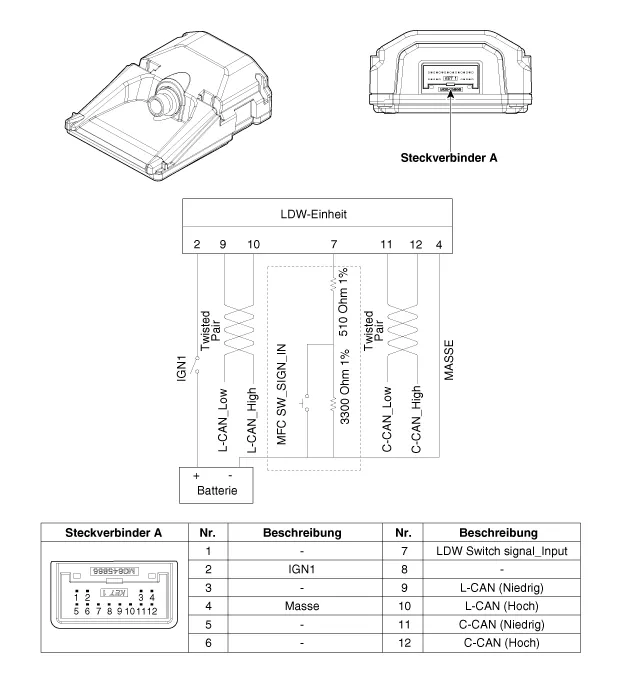 Bauteile und bauteile-Übersicht BAUTEILE-ÜBERSICHT 1. LDW-EIN/AUS-Schalter 2. Kombiinstrument 3. LDW-Einheit (MFC) * MFC : Kombikamera – Funktion : LDW, HBA, FCA Beschreibung und bedienung Beschreibung SYSTEM BLOCKDIAGRAMM LDW-Bauteile NEIN Pos.