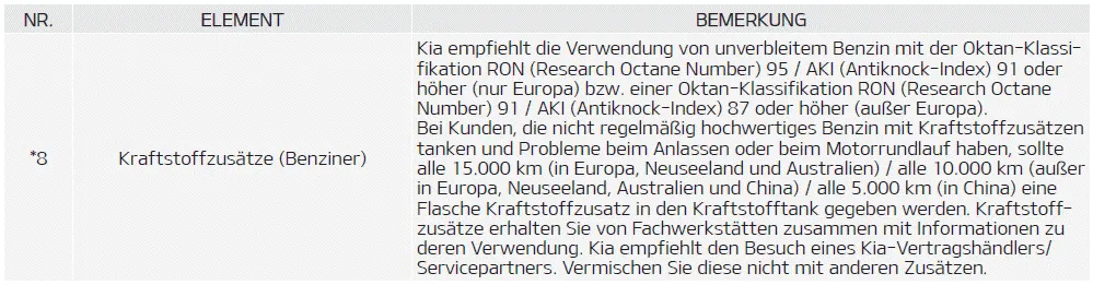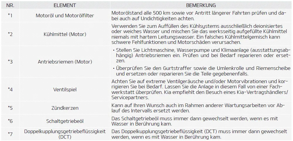 Die folgenden Wartungsarbeiten müssen durchgeführt werden, um die ordnungsgemäße Funktion der Abgasregelung und die Leistung sicherzustellen. Bewahren Sie die Nachweise aller Abgasuntersuchungen auf, um Ihre Garantie aufrechtzuerhalten. Sofern sowohl die Kilometeranzahl als auch die Zeit angezeigt werden, wird die Häufigkeit des Services dadurch bestimmt, was zuerst eintritt.