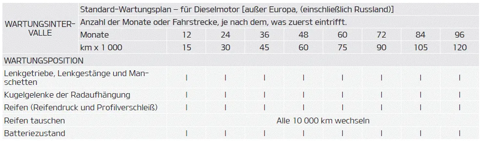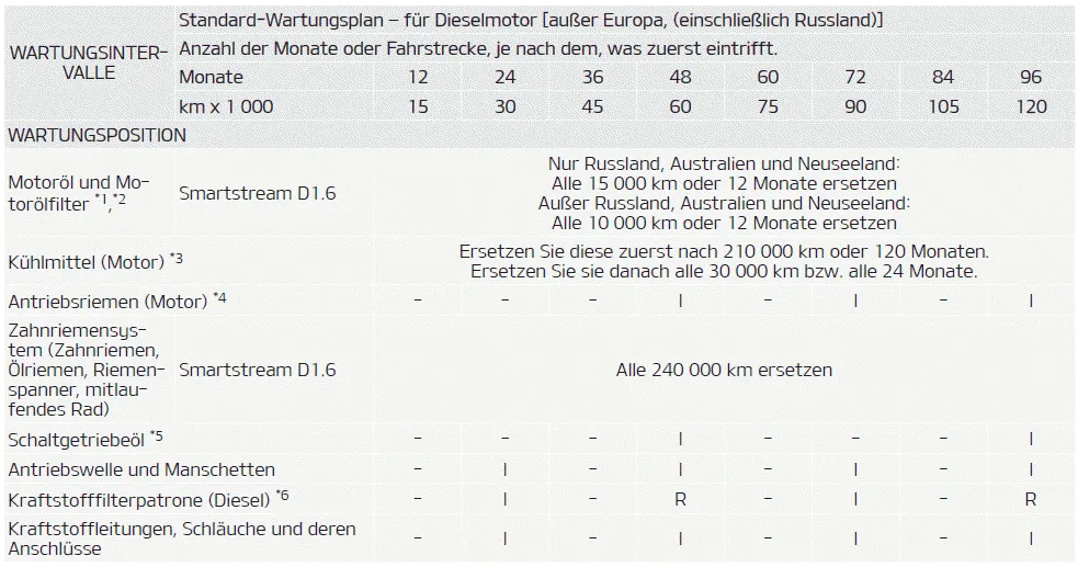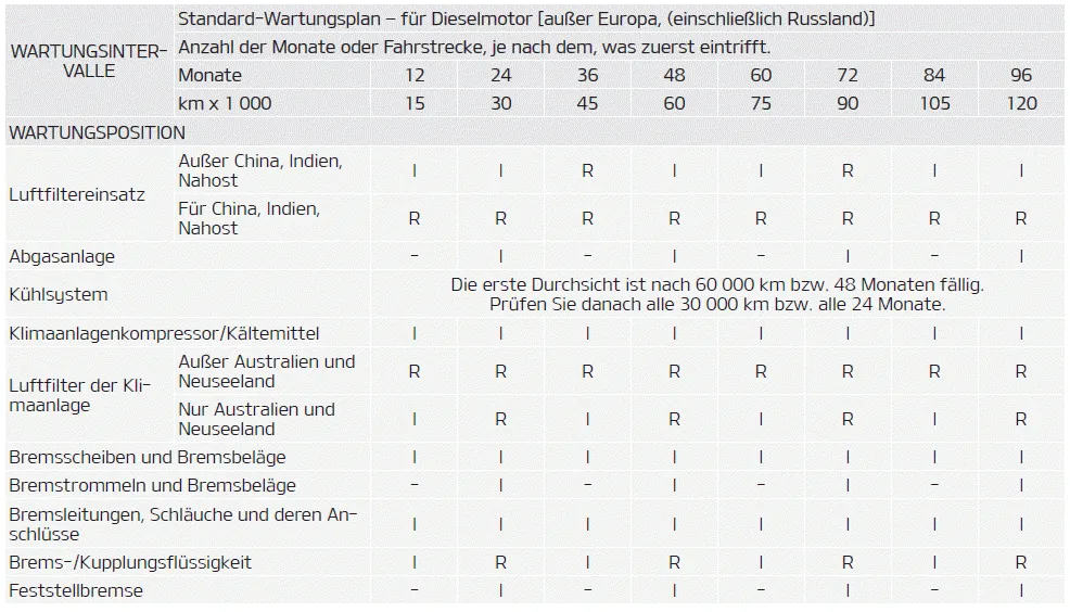 WARTUNGSART I: Prüfen und bei Bedarf einstellen, korrigieren, reinigen oder ersetzen. R: Ersetzen oder wechseln. ERSCHWERTE EINSATZBEDINGUNGEN A: Wiederholte Fahrten über kurze Strecken unter 8 km bei Normaltemperatur oder unter 16 km bei Frost.
