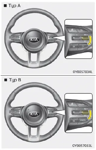 3. Drücken Sie den Hebel nach unten (in Richtung SET-) und lassen Sie ihn bei Erreichen der gewünschten Geschwindigkeit los. Die Tempomat- Kontrollleuchte leuchtet auf. Lassen Sie gleichzeitig auch das Gaspedal los. Die eingestellte Geschwindigkeit wird nun automatisch beibehalten.
