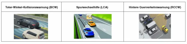 System für hintere Querverkehrswarnung (RCCW) : Gibt beim Rückwärtsfahren Alarme für von hinten und der Seite herannahende Fahrzeuge aus. |