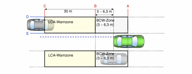 Bedingungen für das Einschalten der LCA-Warnung ① Die gesamte Karosserie des Zielfahrzeugs befindet sich hinter der Linie B. ② Ein beliebiger Teil des Zielfahrzeugs überschreitet die Linie C. ③ Ein beliebiger Teil des Zielfahrzeugs überschreitet die Linie D und Hysterese Ein. ④ Der gesamte Teil des Zielfahrzeugs überschreitet die Linie E und Hysterese Ein. ⑤ Unter allen obigen Bedingungen beträgt die TTC (Zeit bis zur Kollision) weniger als 3 Sekunden.