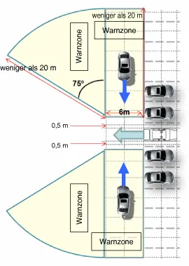 ① Diese Funktion unterstützt den Fahrer beim Zurücksetzen aus einer Parklücke, indem es Fahrzeuge erfasst, die sich von hinten bzw. seitlich annähern und per Sicht nicht erkannt werden können. ② Befindet sich das Zielfahrzeug basierend auf der TTC (Zeit bis zur Kollision) in einem Abstand von 2 s, wird eine Warnung ausgegeben. Bei den Warnungen für den Fahrer werden Fußgänger nicht als Hindernis betrachtet (es erfolgt u.U. keine Warnung).