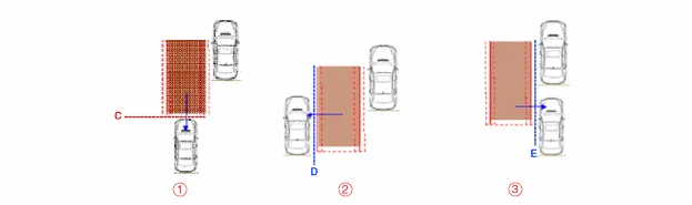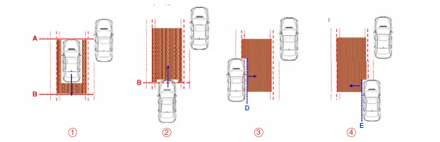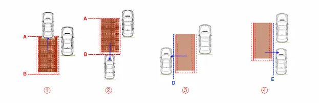 Bedingungen für das Ausschalten der BCW-Warnung ① Die gesamte Karosserie des Zielfahrzeugs bewegt sich vor die Linie A. ② Die gesamte Karosserie des Zielfahrzeugs bewegt sich hinter die Linie B. ③ Die gesamte Karosserie des Zielfahrzeugs überschreitet die Linie D und Hysterese Aus. ④ Der gesamte Teil des Zielfahrzeugs überschreitet die Linie E und Hysterese Aus.