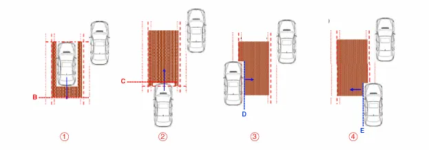 Bedingungen für das Einschalten der BCW-Warnung ① Die gesamte Karosserie des Zielfahrzeugs befindet sich hinter der Linie A. ② Ein beliebiger Teil des Zielfahrzeugs überschreitet die Linie B. ③ Ein beliebiger Teil des Zielfahrzeugs überschreitet die Linie D und Hysterese Ein. ④ Der gesamte Teil des Zielfahrzeugs überschreitet die Linie E und Hysterese Ein.
