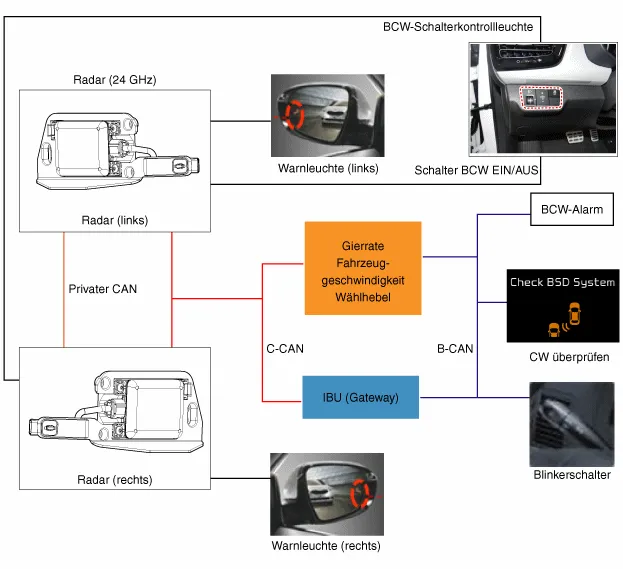 Beim BCW handelt es sich um ein System, das zwei Magnetwellen-Radarsensoren verwendet, die am hinteren Stoßfänger befestigt sind, um den Abstand zum nachfolgenden Fahrzeug zu messen. Zusätzlich zur Erfassung gibt es einen (visuellen und akustischen) Alarm aus, wenn ein Fahrzeug in den toten Winkel eintritt.