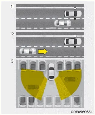 3. Querverkehrswarnsystem (RCCW) Wenn Ihr Fahrzeug rückwärts fährt, erkennt der Sensor Fahrzeuge links oder rechts neben Ihrem Fahrzeug und gibt eine Warnung aus.