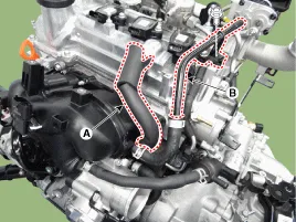 Schlauch (A) der Kurbelgehäuseentlüftung (PCV) abtrennen und dann Bremsunterdruckschlauch (B) entfernen.