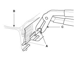 Klettband (A) und Ringclips (B) entfernen, dann Vordersitzpolsterbezug (C) von der Vorderseite des Sitzpolsterrahmens entfernen.