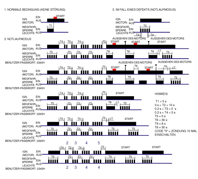 Verfahren zum Anlernen des 4-stelligen Benutzer-Passcodes Das Benutzerpasswort für begrenzte Aufhebung wird in der Kundendienstwerkstätte programmiert. Der Fahrzeugeigentümer kann eine vierstellige Nummer wählen. Die Programmierung des Benutzer-Passcodes ist nur für ein "angelerntes" PCM (ECM) möglich. Vor dem ersten Anlernen des Benutzer-Passcodes ist der Status des PCM (ECM) 'unprogrammiert'. Die Limp Home-Funktion kann nicht angewendet werden. Das Verfahren beginnt damit, dass die Zündung mit einem gültigen Transponderschlüssel (programmierter Schlüssel) eingeschaltet wird und dass der Benutzer-Passcode über das Diagnosegerät gesendet wird. Nach erfolgreicher erster Anlernprozedur des Benutzer-Passcodes ändert sich der Status von 'unprogrammiert' nach 'angelernt'. Ein angelernter Passcode kann auch wieder geändert werden. Dies ist möglich, solange der Status "Angelernt" lautet. Um die Zugangsberechtigung zu erhalten, mit dem Diagnosegerät entweder den alten Passcode oder die spezifischen Fahrzeugdaten an das ECM senden. Wenn die Zugangsberechtigung erkannt wurde, forder das PCM (ECM) den neuen Passcode an. Danach bleibt der Status "Angelernt" bestehen und der neue Benutzer-Passcode ist gültig. Wenn 3-mal hintereinander oder kurzzeitig unterbrochen ein falscher Benutzer-Passcode oder falsche fahrzeugspezifischen Daten an das PCM (ECM) übertragen werden, sperrt das PCM (ECM) die Anfrage nach Änderung des Passcodes für 1 Stunde. Diese Zeitspanne kann weder durch Abklemmen der Batterie noch durch eine andere Manipulation verkürzt werden. Nach dem Wiederanschließen der Batterie beginnt der Zeitgeber die Stunde von neuem.