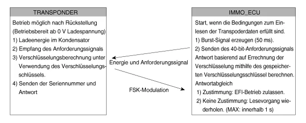 Das von der Antennenspule empfangene Funksignal wird von der Wegfahrsperren-Einheit in Meldungen für die serielle Kommunikation umgewandelt. Die vom PCM (ECM) empfangenen Meldungen werden in ein Funksignal umgewandelt, das über die Antenne zum Transponder übertragen wird.