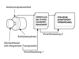Die Kommunikation mit der Wegfahrsperre erfolgt über den in den Schlüssel eingebauten Transponder. Die drahtlose Kommunikation läuft auf RF (Funkfrequenz von 125 kHz). Die Wegfahrsperre ist hinter dem Armaturenbrett in der Nähe des Querträgers montiert.