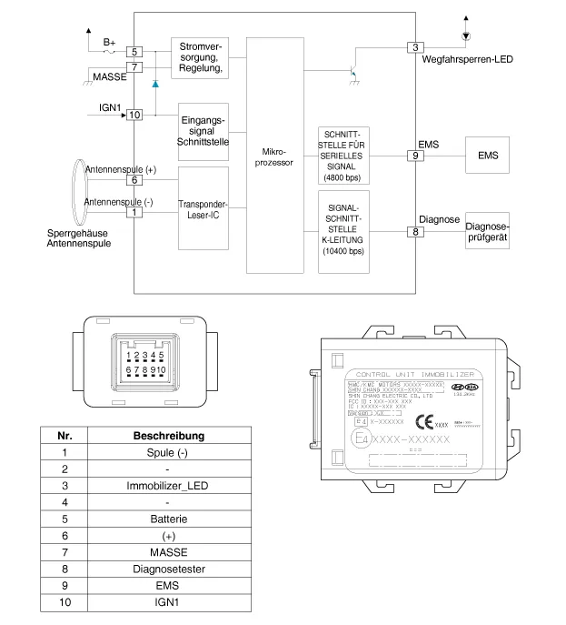 Die WEGFAHRSPERRE führt keine Gültigkeitsprüfung durch und berechnet auch nicht den Verschlüsselungsalgorithmus. Diese Vorrichtung ist nur eine Schnittstelle, die die empfangenen Transpondersignale in serielle Daten zum PCM (ECM) und umgekehrt umwandelt.