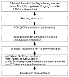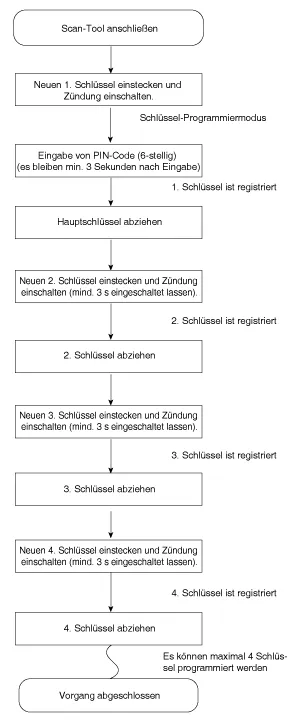 Das Anlernen der Schlüssel entspricht der Vorgehensweise für ein unprogrammiertes PCM (ECM). Die fahrzeugspezifischen Daten müssen aufgrund der eindeutigen Programmierung des Transponders unverändert werden. Wenn Daten geändert werden sollen, müssen neue Schlüssel mit einem noch nicht programmierten Transponder verwendet werden.