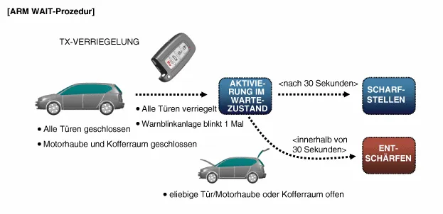 Hinweis 1: Die Funktion ARM HOLD verschiebt die Aktivierung des ARM-Modus nur für die Heckklappe. Bei aktiviertem ARM HOLD-Modus wird der ARM-Modus für Türen und Motorhaube aktiviert.