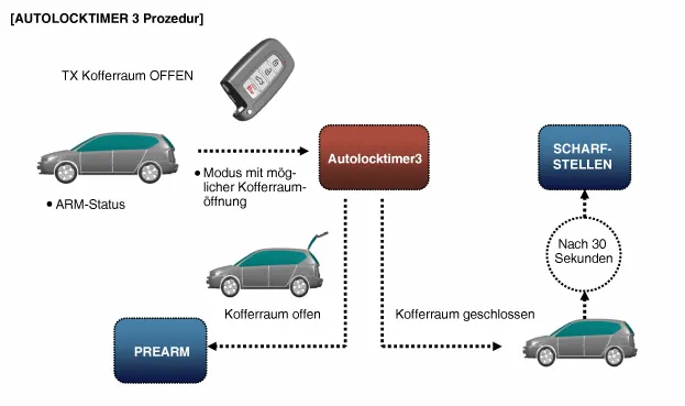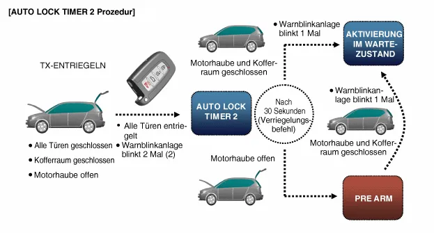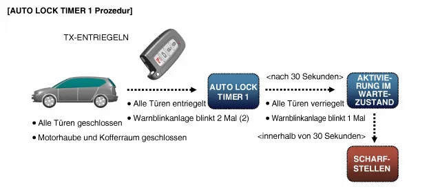 dem AUTO LOCK Timer 2 abgelaufen ist und alle Türen geschlossen sind.
