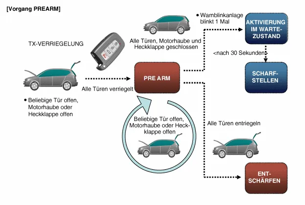 1-2 Sobald der Fahrer die Motorhaube oder die Heckklappe schließt, blinkt die Warnblinkanlage einmal, dann schaltet das Fahrzeug automatisch über den "ARM WAIT"-Modus in den "ARM"-Modus. 2-1 Wird die LOCK-Taste gedrückt, während noch mindestens eine Tür, die Motorhaube oder die Heckklappe geöffnet sind, wird in den "PRE ARM"-Modus geschaltet. 2-2 Weil das Signal Alle Türen verriegeln ausgegeben wurde, aber die Bedingungen für "ARM WAIT" nicht erfüllt sind, bleibt das Fahrzeug im Standby-Modus und schaltet über ARM WAIT auf den ARM-Modus, sobald die geöffnete Tür geschlossen wird. 2-3 Wenn im PRE ARM-Modus ein Eindringen in den Fahrzeuginnenraum erkannt wird, schaltet das System in den DISARM-Modus. 2-4 Im PRE ARM-Modus blinkt die Sicherheitskontrollleuchte. |