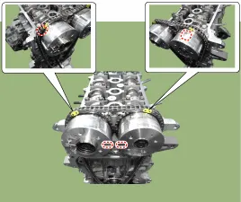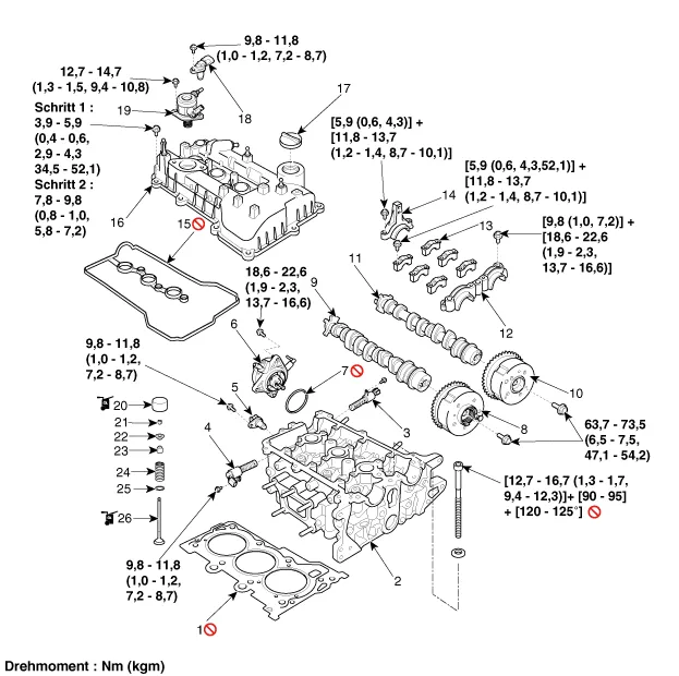 1. Zylinderkopfdichtung 2. Zylinderkopf 3. Einlass-Ölregelventil (OCV) 4. Auslass-Ölregelventil (OCV) 5. Auslassnockenwellensensor (CMPS) 6, Unterdruckpumpe 7, Unterdruckpumpe O-Ring 8, Auslass-CVVT-Einheit 9. Auslass-Nockenwelle |